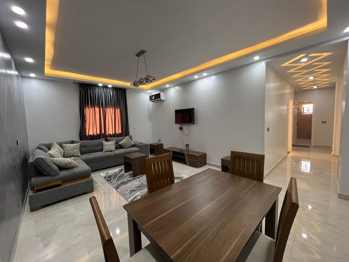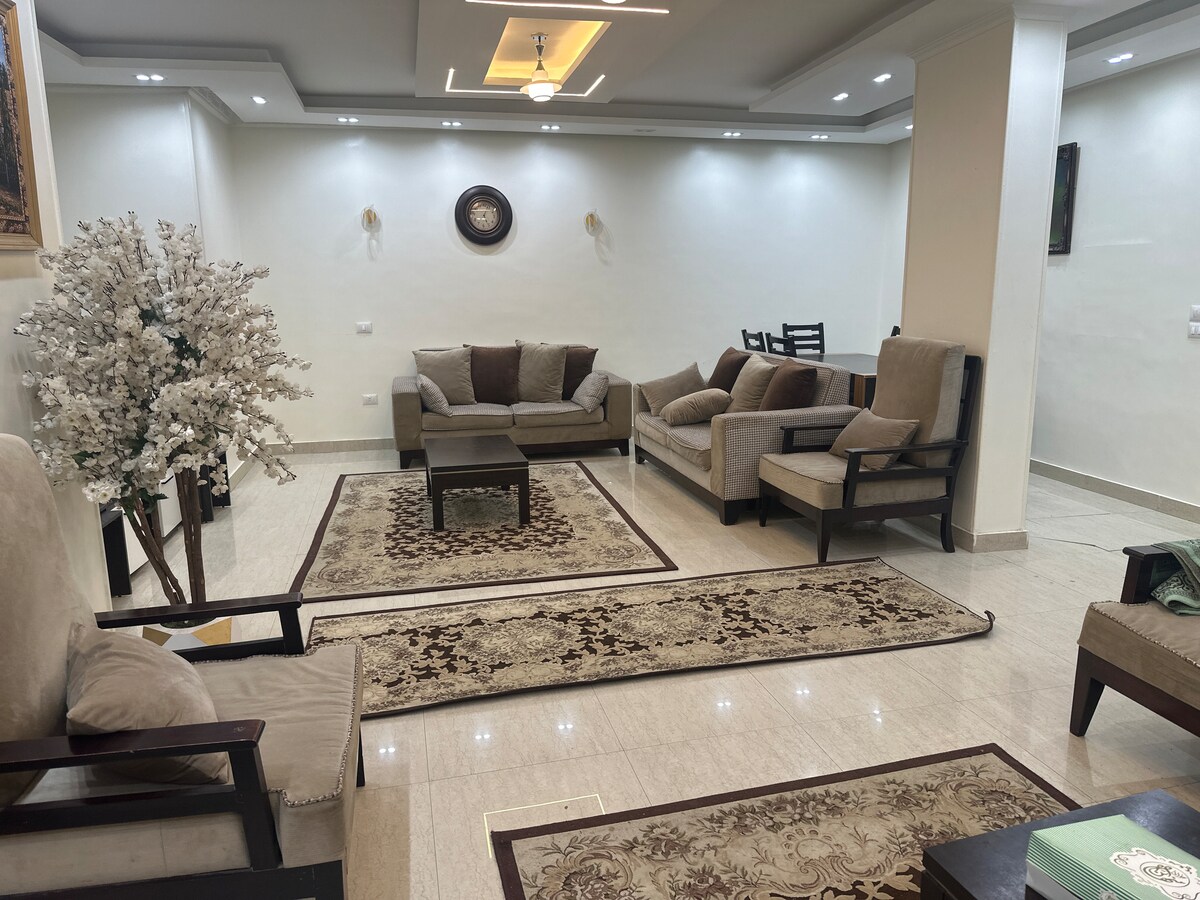 Mantenlo simple en este lugar tranquilo y céntrico. Disfrutá de una experiencia espaciosa en este departamento individual céntrico y recientemente amueblado en la ciudad de 6 de octubre, El Cairo, a solo unos segundos de muchos cafés, cines, restaurantes, tiendas de comestibles y supermercados. A 10 minutos del aeropuerto de la Esfinge y del centro comercial Arabia y a 25 minutos del centro de la ciudad, las grandes pirámides y los museos.