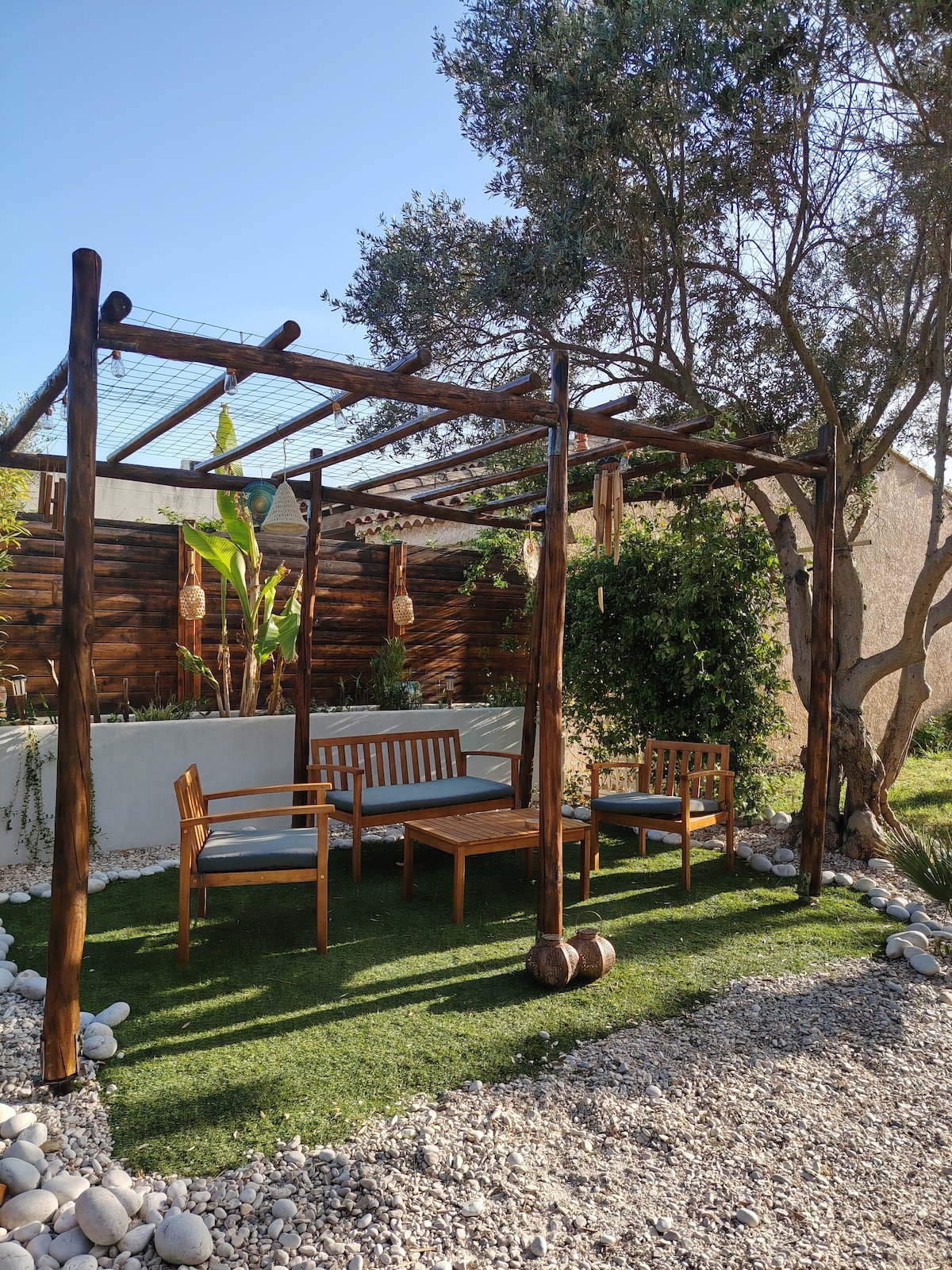 Dependencia de 23 m2 . Ideal para una pareja (+niño y/o bebé), con una cama de 2 plazas y, bajo petición, una cama infantil y/o cuna. No fumadores. 2 terrazas (1 muebles de jardín/barbacoa + 1 cubierta con mesa). Posibilidad de utilizar la cabaña bajo petición (con electricidad). Zona tranquila en residencia y aparcamiento privado. En la ciudad (a 5 minutos), centro cultural, cine, teatro, museo, playa (vela, «kitesurf»), club de remo y mercado. A 15 minutos de Marsella o Aix-en-Provence y a 15 minutos de las playas de la Costa Azul.