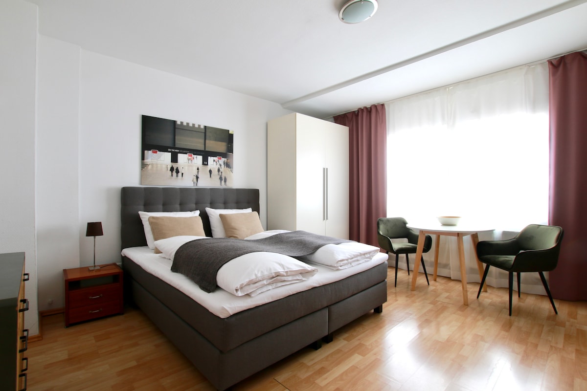 Sunny, exclusive 1-room apartment in Cologne city center for 1-2 people; open floor plan, underfloor heating, comfortable bed (1.40 x 2m), stylish living area, kitchen, high-quality built-in furniture; modern bathroom design with daylight / exclusive furnishings; high-speed WiFi up to 100 mbit/sec; elaborate lighting design 3 min. to the shopping streets, restaurants and bars on the doorstep, 800 meters to the cathedral, freeway A57 by car in 5 min. Bookings of 90 days or more on request.