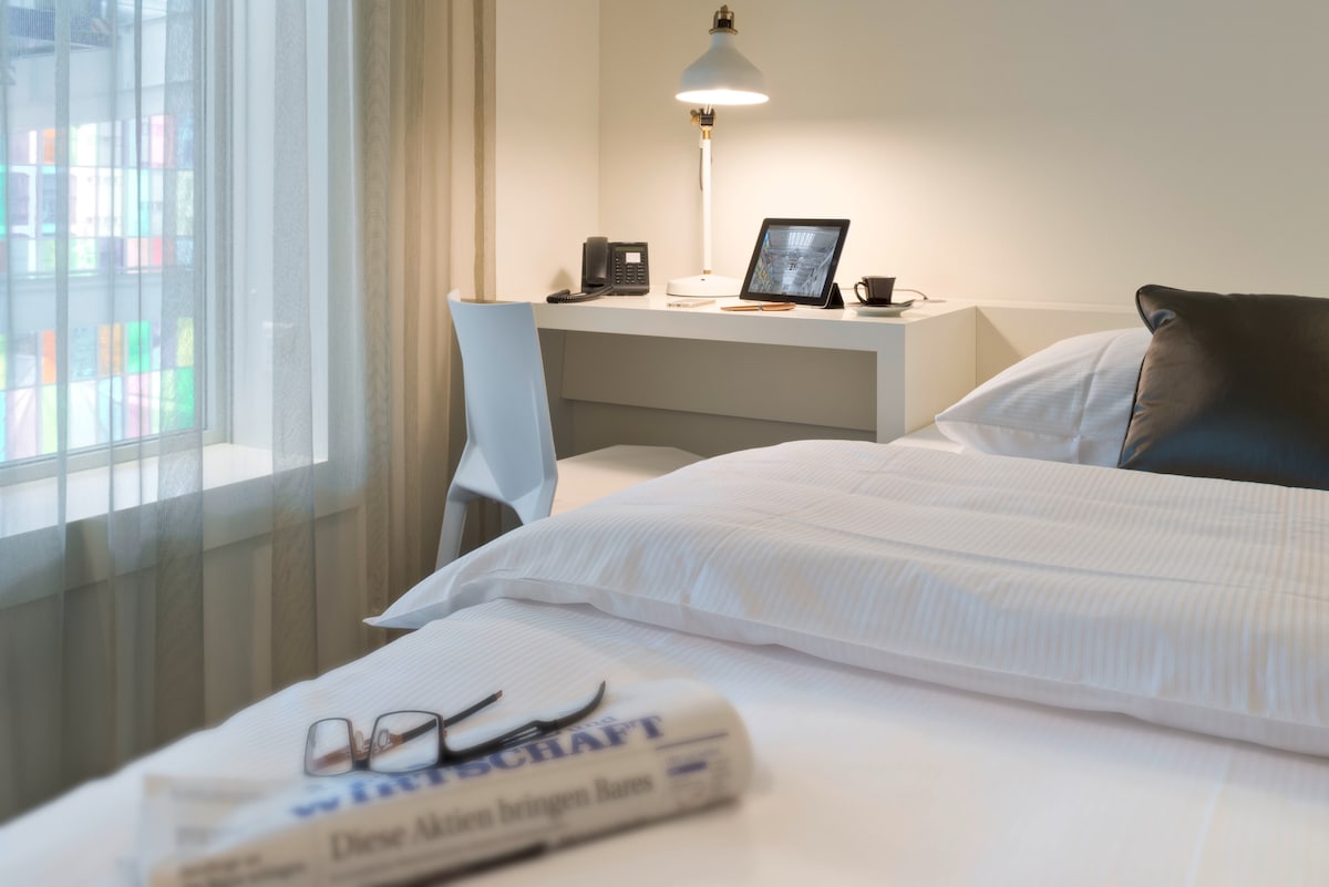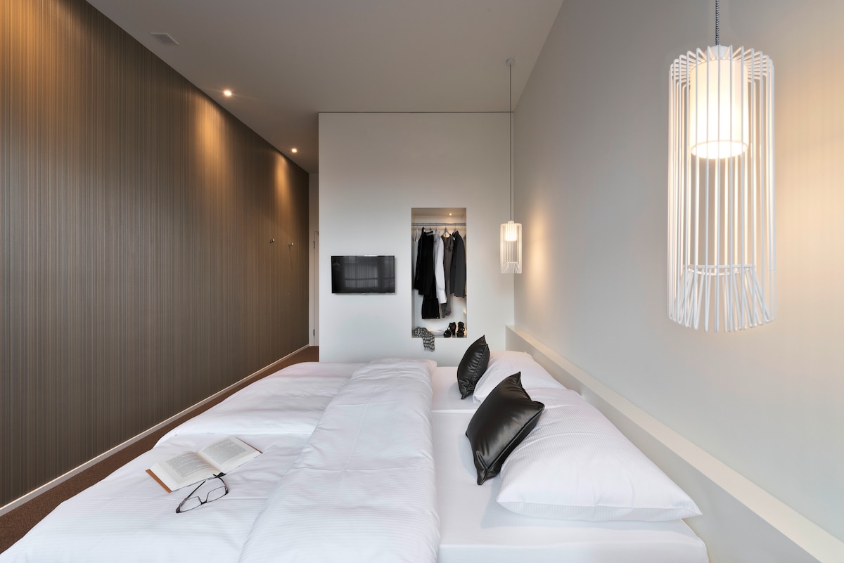18 m² /cama tamaño queen (1,20 m - 1,40 m x 2,00 m) Nuestras habitaciones individuales de estilo con aire acondicionado ofrecen la mejor comodidad para dormir gracias a las camas de calidad. En el escritorio puedes hacer trabajo privado o de negocios, con wifi gratuito y teléfono gratuito en Suiza. El portátil cabe en la caja fuerte y el secador de pelo también está incluido, así como los productos de belleza. A través de los grandes ventanales puedes disfrutar del juego de colores de las 660 coloridas ventanas de cristal del artista Ugo Rondinone.
