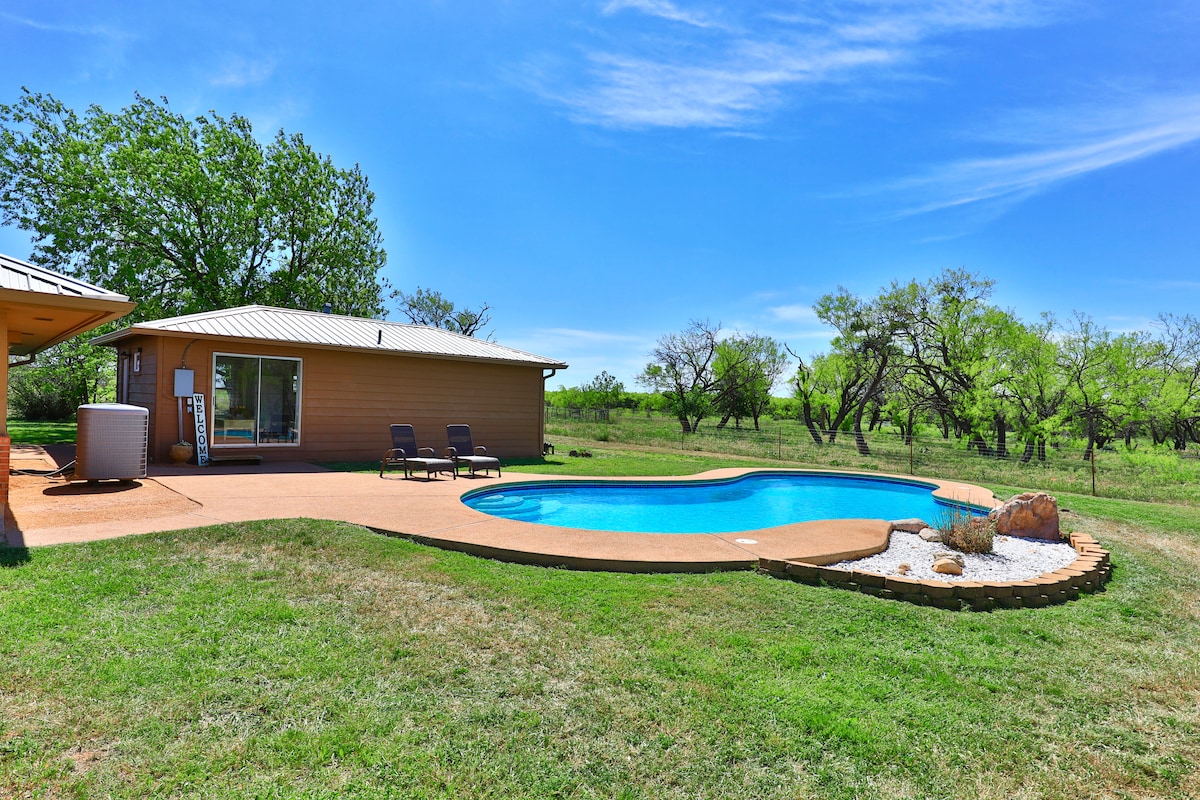 The "Cottage" is a private one-bedroom, one-bathroom guest house with a full kitchen that overlooks the backyard pool. The house is situated on 40 acres outside the city limits of Abilene, Texas (Potosi.) When you arrive, you may see horses grazing out in the pasture, two loving Collies & the farm cat "Major." We hope that our guests enjoy the peaceful country all while being minutes away from entertainment, restaurants, airport & hospitals.
