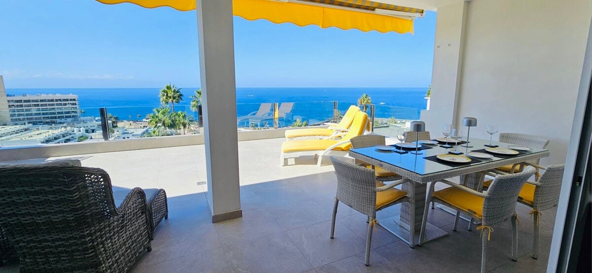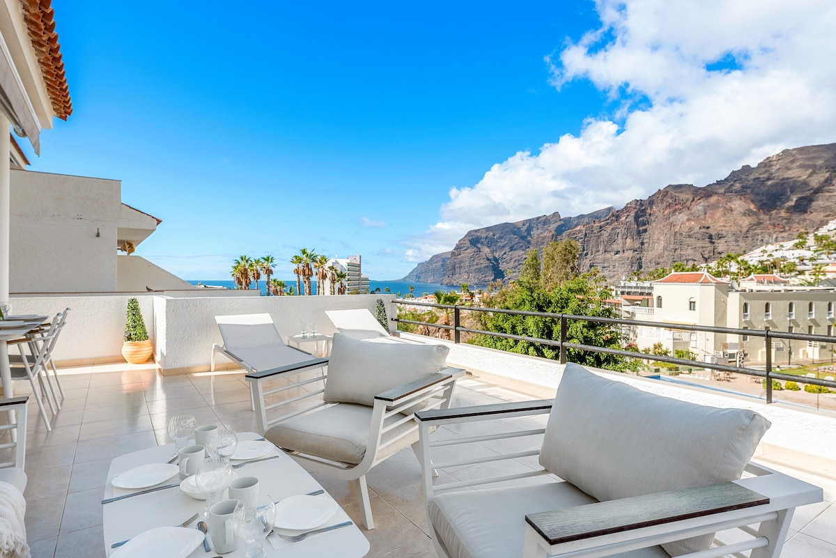 Bienvenido a Blue Haven, un lujoso penthouse recién reformado que ofrece impresionantes vistas al océano, a la puesta de sol, a la marina y acantilados de Los Gigantes. Este impresionante ático de 3 habitaciones cuenta con acabados y ropa de cama de alta gama, una relajante piscina comunitaria y jacuzzi privado, asegurando una estancia extraordinaria. Una atmósfera de vacaciones inmediata y serenidad te rodeará, acompañada por el sonido de las olas del océano. Un verdadero refugio de paz.