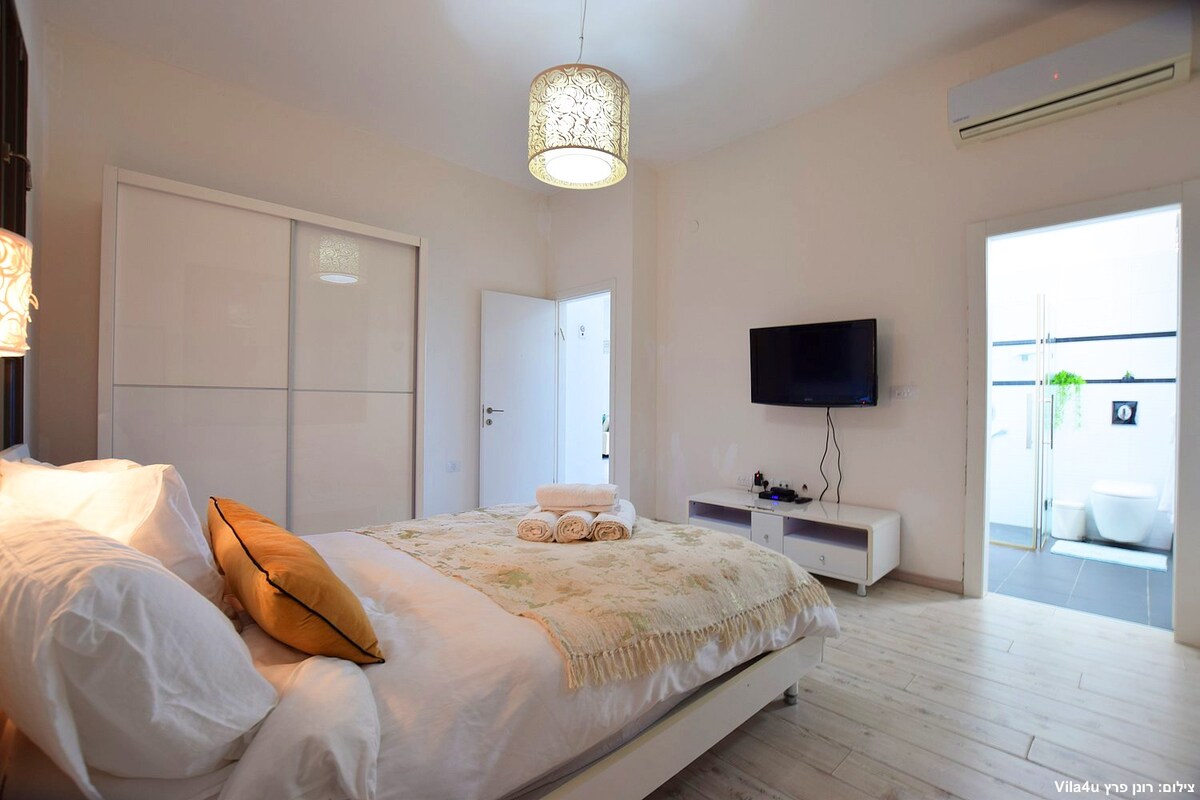 El nuevo apartamento con jardín diseñado en Achziv. En la entrada del apartamento te reunirás en una amplia sala de estar, una mesa de comedor grande y espaciosa, una cocina totalmente equipada que necesitarás para que tus vacaciones sean excelentes. Tiene tres dormitorios, 2 baños. Cada uno de los dormitorios está decorado en tonos de color blanco y crema limpia combinado con madera. La suite se abre a un balcón privado donde encontrarás una lujosa piscina y un jacuzzi redondo de spa.