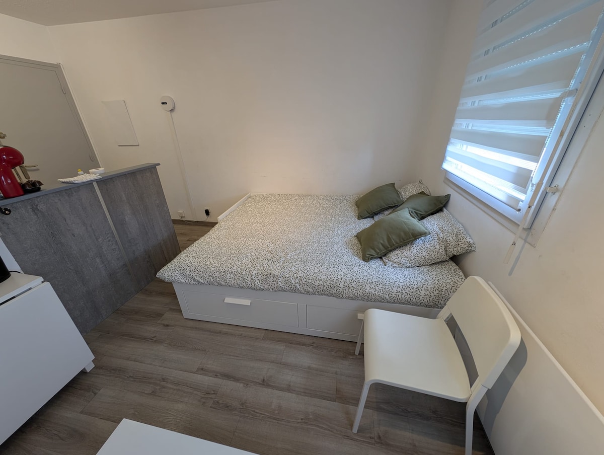 Agradable pequeño estudio nuevo para 1 persona, en la planta baja del lado de la calle, disfrutará de su ubicación cerca de la estación de tren TGV y la Universidad a solo 5 minutos a pie. Debido a su superficie, es ideal para 1 persona, pero puede ser adecuado para 2 personas para estadías cortas.