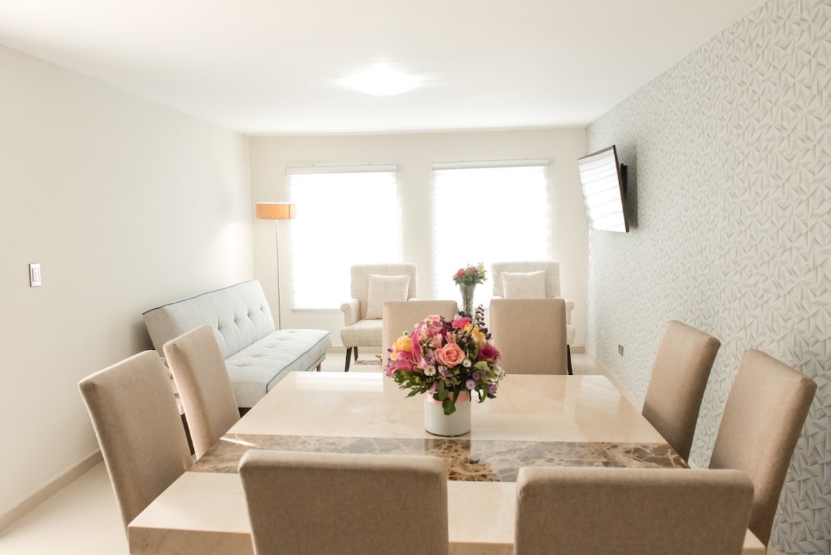 Casa Rosales es ideal para familias o grupos. Totalmente amueblada, cuenta con 3 recámaras con baño privado, cama Queen size, tocador, clóset y A/C. Cocina equipada con todo lo necesario, sala y comedor muy amplios, 2 TV LG de 55”, lavadora y secadora. Estacionamiento para 2 autos con videovigilancia, acceso a terraza y patio interior. Espacio cómodo, seguro y con excelente ubicación. ¿Necesitas más espacio? También hay lofts individuales y de 2 recámaras en el segundo piso