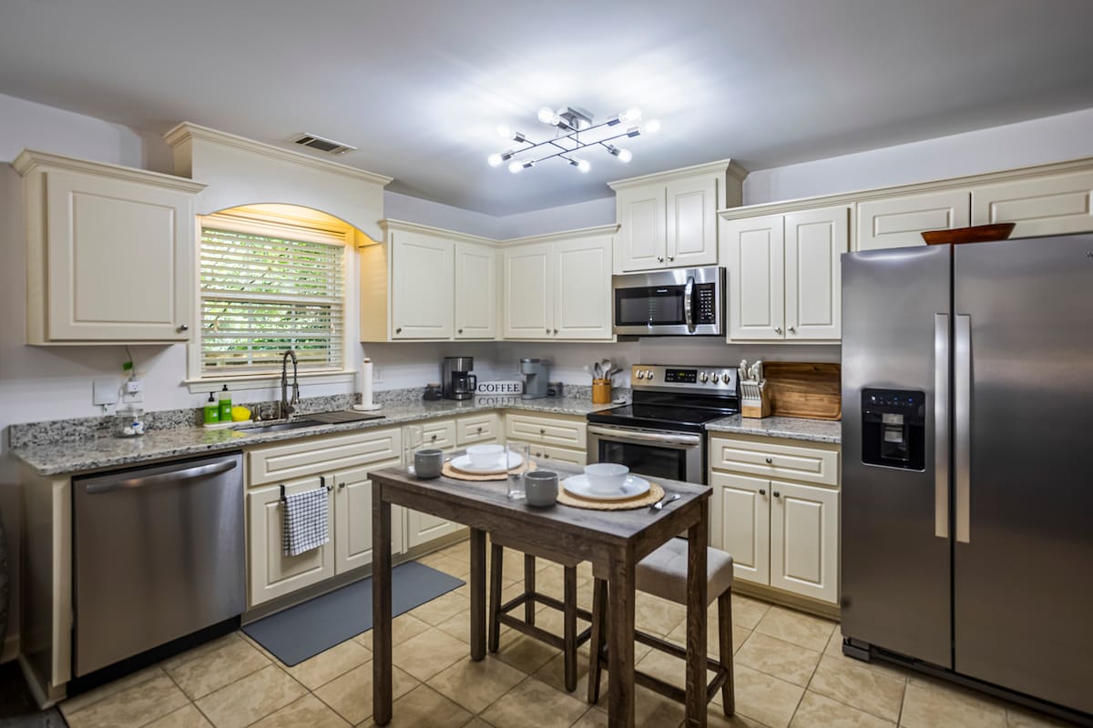 Experimenta la combinación perfecta de encanto histórico y lujo moderno en esta hermosa propiedad de alquiler vacacional en Aiken, Carolina del Sur. Ubicado en una ubicación céntrica a solo 8 manzanas del centro histórico de Aiken, ¡este es un paraíso ecuestre y de golfistas! En el interior, la casa ha sido completamente renovada para combinar el encanto vintage de la década de 1930 con todas las comodidades modernas que puedas necesitar. Te encantará la preciosa cocina actualizada, perfecta para preparar comidas después de un largo día de golf o paseos a caballo.