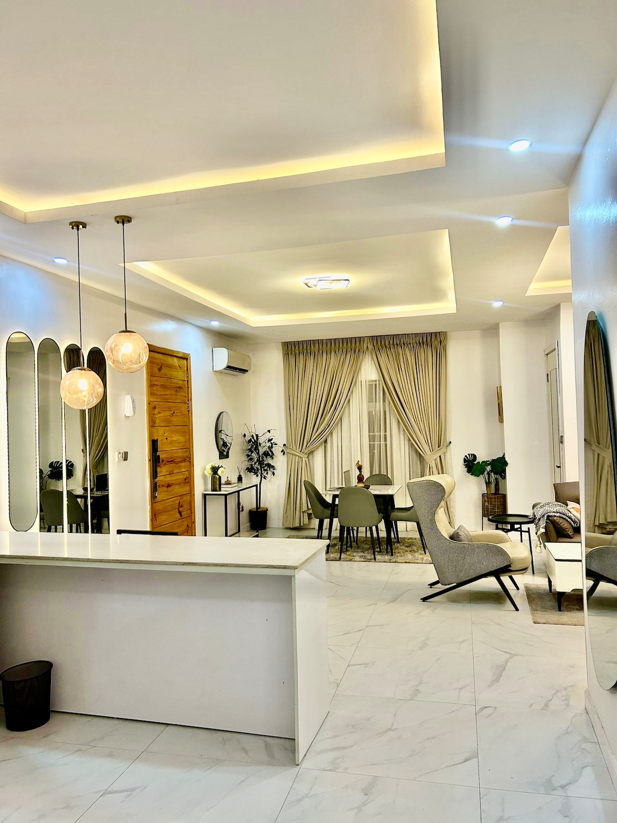 Ubicadas en la impresionante Royal Pine Estate, Lekki. Nuestras casas de lujo de 4 dormitorios no son solo un lugar para alojarse, sino una experiencia. Imagina esto: una amplia sala de estar donde puedes relajarte, un dormitorio principal con vestidor y habitaciones con baño privado. Tenemos WiFi y televisores inteligentes ilimitados en todas las habitaciones. ¡Disfruta de nuestro gimnasio, billar e instalaciones de tenis de mesa! Y cuando llegue el momento de cocinar, nuestra cocina totalmente equipada tiene todo lo que necesitas, ¡piensa en la lavadora e incluso una PS5 para el entretenimiento!