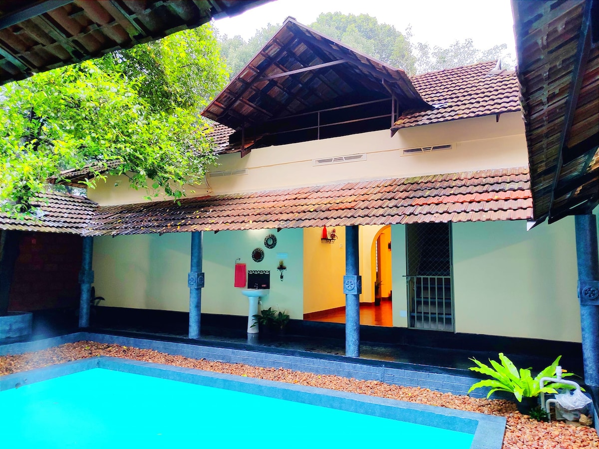 Rodeado de exuberante vegetación y flora vibrante, cuenta con espacios acogedores diseñados para relajarse. Disfruta del suave sonido de las olas o el canto de los pájaros, con grandes ventanales para traer luz natural y brisas tropicales. Esta casa es ecológica y funciona con energía solar. A 14 km de Kotayam, a 14 km de Pala, a 6 km de la iglesia de Manarcad, Ettumanoor, a 6 km. Está situado en un lugar tranquilo y abandonado. Está en Ayrkunnam. ¡Incluso contamos con baños de estilo americano!