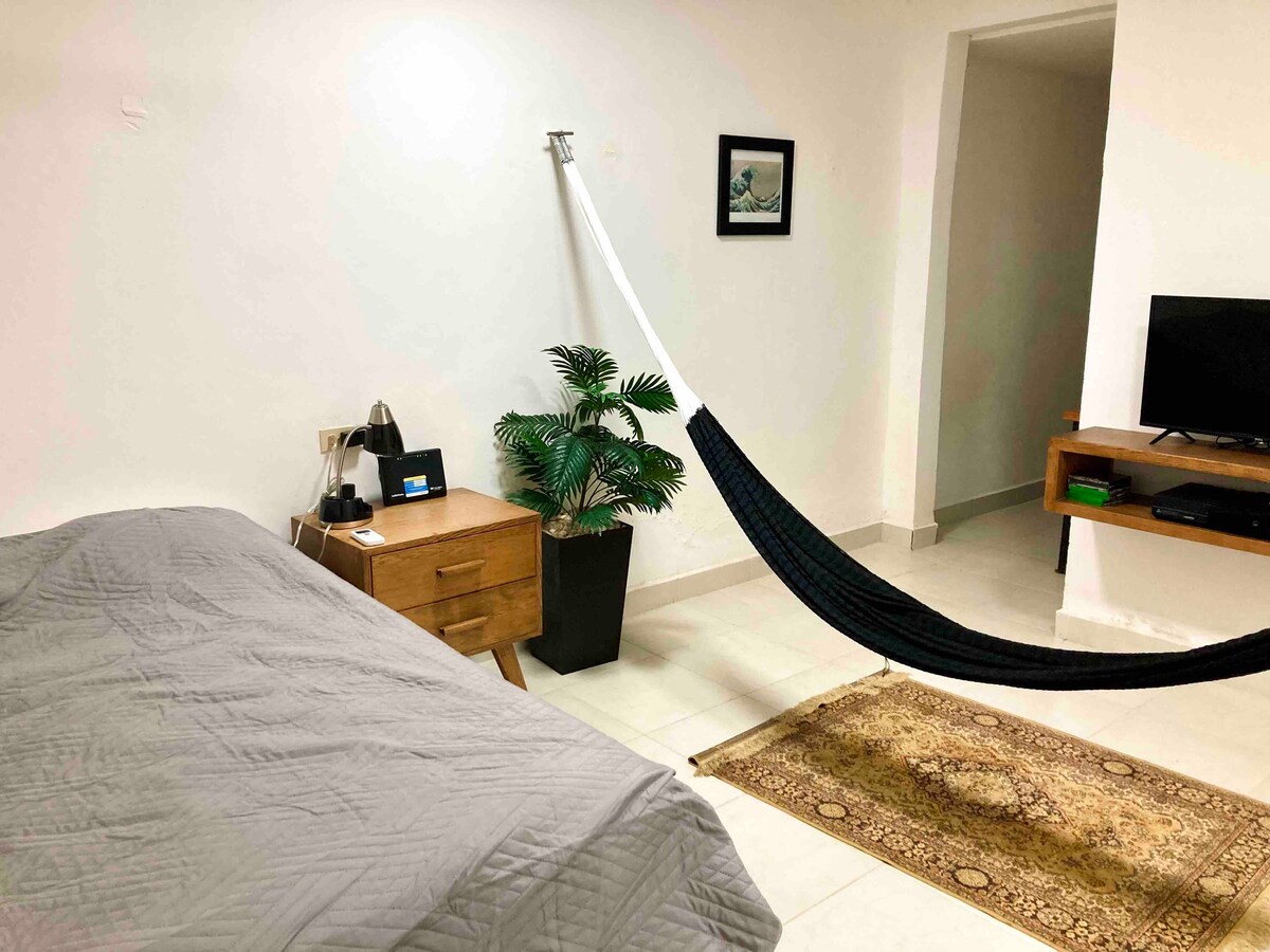 Pequeño y confortable departamento. Ofrece un espacio fresco y agradable para descansar después de un caluroso día. Ubicado en pleno Centro Histórico, al que se llega a pie y donde podrá visitar la imponente Iglesia de San Juan, tomar un helado en el kiosco y descansar en el Parque Principal como hace la gente local.