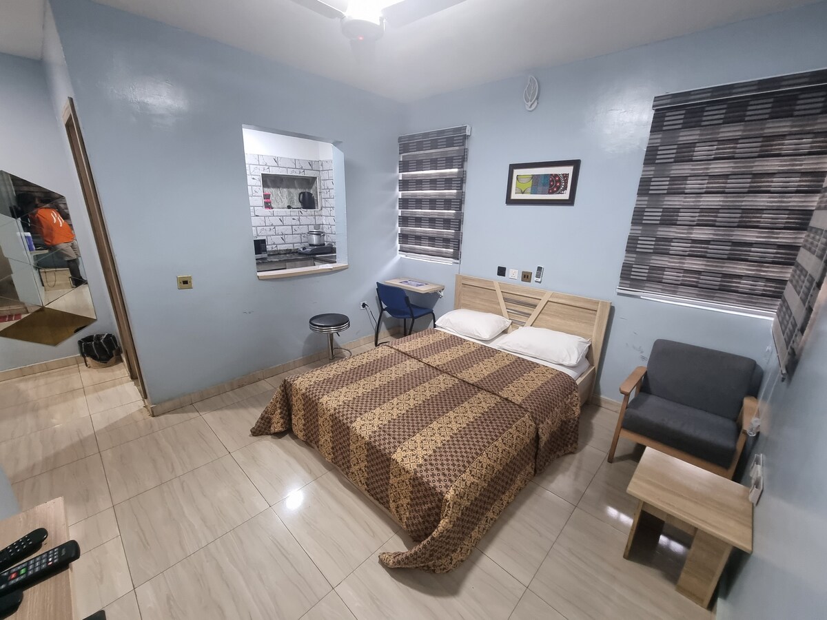 Beautiful & well ventilated self-contain premium serviced apartments are available for short let in a serene and secure environment just 5 minutes drive to the University of Ibadan. Facilities include; 24 Hour Solar Inverter Power Supply, Wardrobe, Air Conditioning, en-suite bathroom furnished kitchen with Microwave Oven, Inverter Refrigerator, Treated Water supply, Free laundry CCTV Permanent 24-hour security guard, Electric fencing system & Spacious car park Wifi is under maintenance