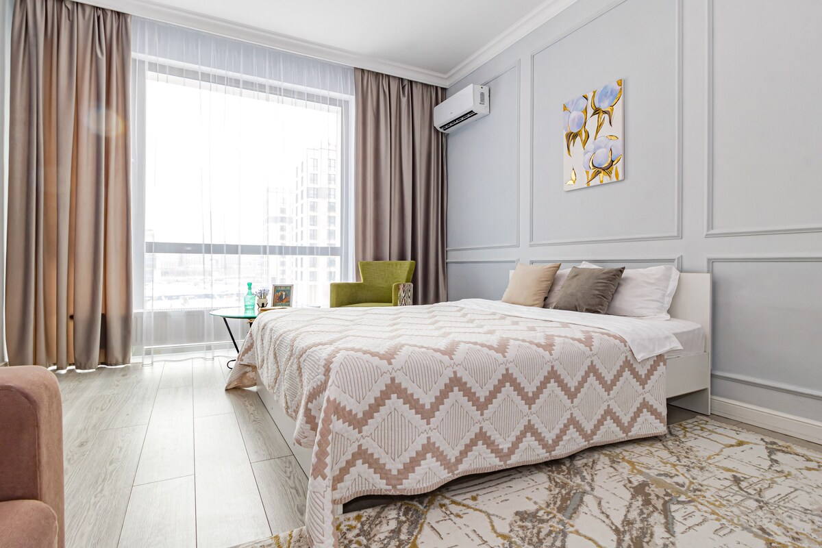 Apartamento elegante y acogedor en un complejo residencial de clase ejecutiva a la izquierda. Estimados huéspedes para ustedes a poca distancia a pie: Khan Shatyr, TD. Saryarka,TD Keruen City, Capital Circus, Water Green Boulevard, Ópera y teatro de ballet, Lovers Park. El apartamento cuenta con todo lo que necesitas para una estancia cómoda: Electrodomésticos a internet wifi Utensilios de cocina , baño. Estamos deseando recibirte en los apartamentos de Assiya