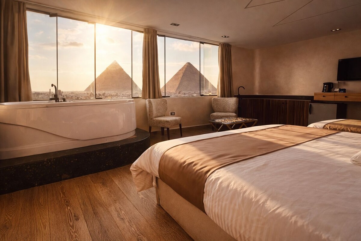Enjoy your stay with Panoramic View of the giza pyramids and sphinx Yes! view and pictures are all 100% real. (Be sure to check out our other listings too) Indulge in a stunning view of all the Giza Pyramids from anywhere within this contemporary oriental studio or while relaxing in the Jacuzzi. It is also a 10 min walk from the Pyramids entrance gate. To make the most of your trip, make sure to check out our experiences! We're committed to providing our guests the magical hospitality