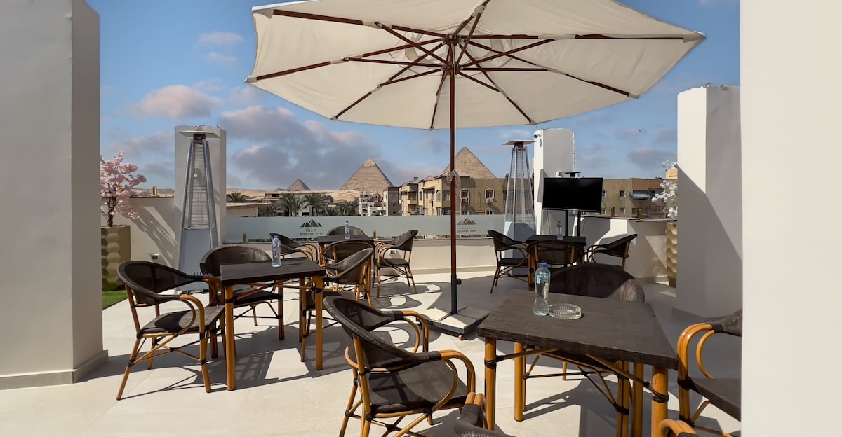 ¡Te damos la bienvenida a tu refugio privado en la azotea en el corazón de Guiza! Este encantador estudio se encuentra en una amplia azotea, que ofrece vistas impresionantes de las pirámides, perfectas para tomar un café al amanecer, descansar al atardecer en la hamaca o sumergirse en tu propio jacuzzi bajo las estrellas. La cocina está totalmente equipada Zona cómoda para dormir y relajarse Entrada privada para tu paz y privacidad Ya sea que estés aquí por la aventura o la relajación, este estudio ofrece la mezcla perfecta de comodidad y vistas inolvidables.