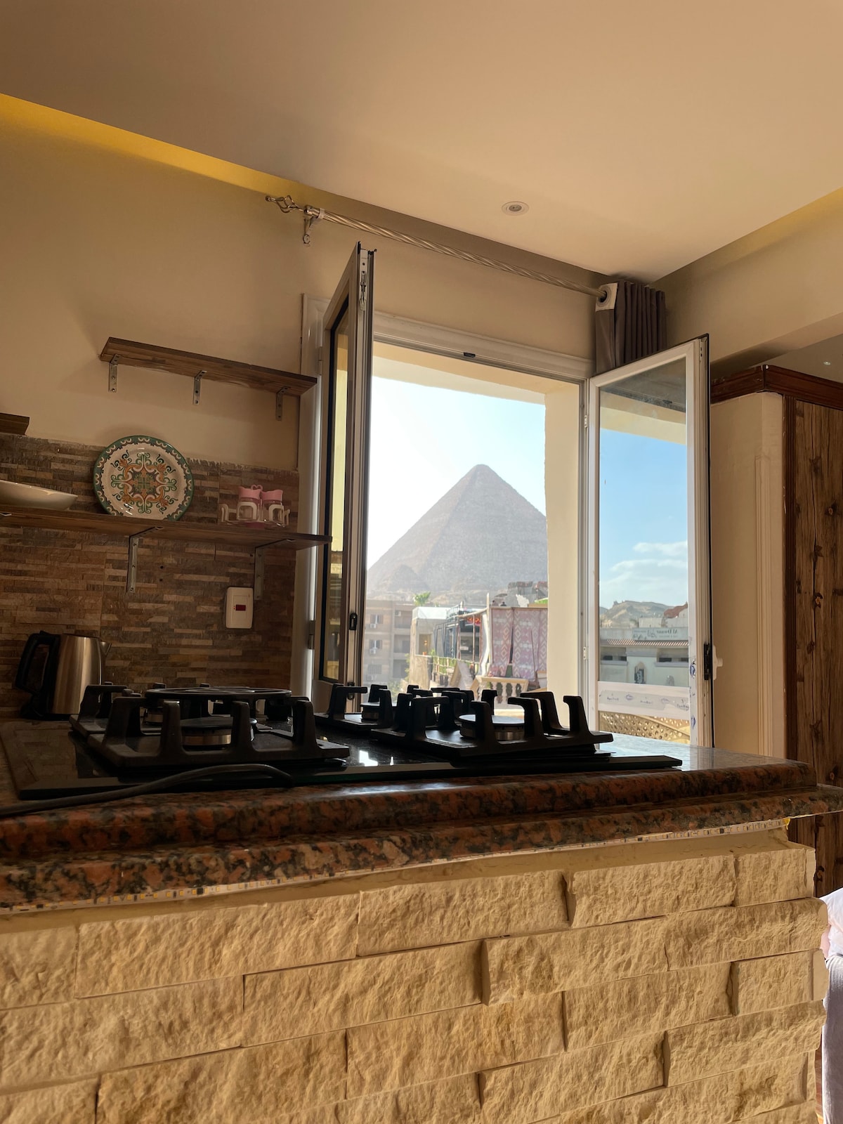 amamos el arte por eso no podemos perder esta vista tan marabellosa, seguridad es nu 1 de importancia para nostros, nuestro apartmento esta localizado en una comunidad privada con la marabellosa vista las Pyramides de Giza y como esta en el quinto piso asi es la vista muy clara y llega a las habitaciones