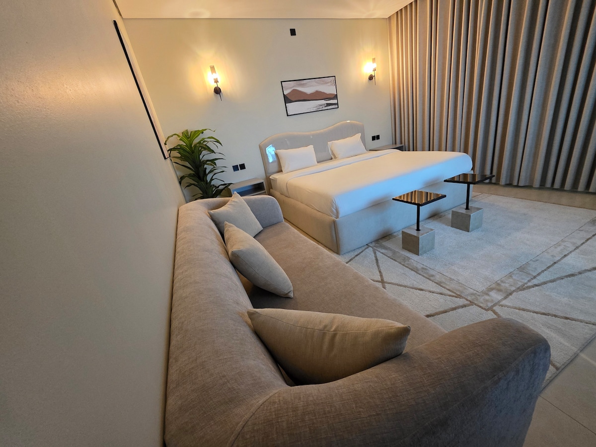 شقة مميزة تتكون من غرفة نوم وصالة وحمام، مصممة بأسلوب أنيق .تحتوي الصالة على بروجيكتور لمتابعة الأفلام والاستمتاع بأجواء ترفيهية مميزة. غرفة النوم تتميز بتصميم عصري، وبقاطع زجاجي أنيق يفصل بين السرير ومنطقة تغيير الملابس، مما يمنح مساحة منظمة وخصوصية إضافية. تتمتع الشقة بموقع استثنائي لقربها من المسجد النبوي الشريف، كما تتوفر عربات غولف على بُعد حوالي 3 دقائق مشيًا على الأقدام. تتجه عربات الغولف في مسارين: • مسار إلى مسجد قباء (٣-٥ دقائق) • ومسار الى الحرم النبوي ( ٣-٥ دقائق)