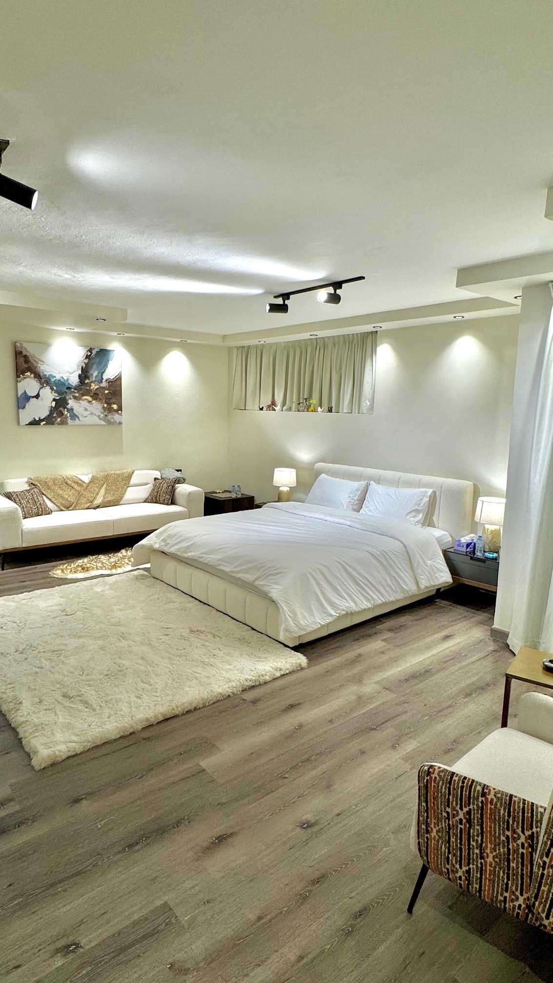 Elegante y espacioso estudio cerca del aeropuerto de Zayed con paredes decorativas, una cocina totalmente equipada, aire acondicionado potente, wifi, IPTV y TV grande. Capacidad para 4 personas con una cama doble, una cama alta y un colchón en el suelo. Incluye espacio de trabajo, baño limpio, estacionamiento a la sombra y un acogedor rincón en la azotea para noches relajantes. Barrio tranquilo, limpio y respetuoso. Cerca del supermercado y del centro comercial Makani. A solo 35 minutos de los principales lugares culturales. Perfecto para la comodidad, el trabajo y el ocio.