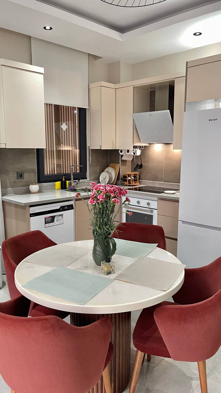 Квартира 1+1 в новом комплексе на 1 высоком этаже из 5, расположена на равном удалении от пляжей Клеопатра и Кейкубат. Спокойно планируйте маршруты: жилье расположено очень удобно, рядом больница, школа, автобусная остановка, магазины, кафе, рестораны. Шторы светонепроницаемые во всех комнатах, фен, полотенца, средства гигиены, посуда и столовые приборы, стол раздвижной, пылесос, ТВ, интернет, двуспальная кровать , диван раскладной, холодильник, эл. чайник, плита, духовка, посудомойка.