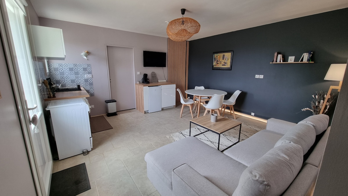 T2 , reciente, de 28 m², en la planta baja de nuestra villa, que consta de un hall de entrada, una habitación principal con una zona de cocina equipada (horno, microondas, cafetera, hervidor de agua, placa de gas y electricidad), una mesa y un sofá cama; un dormitorio independiente con una zona de oficina y un armario; un baño con inodoro y ducha; una zona de lavandería (lavadora y secadora), acceso a nuestro patio. Por favor, envíe un mensaje para especificar si desea que se hagan 2 camas separadas.