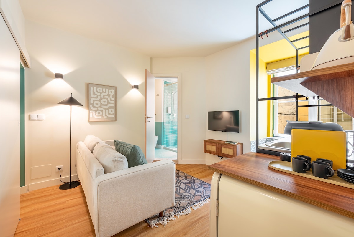 El Yellow Studio está ubicado en un edifício reformado del siglo 18 en el corazón de Mouraria, un barrio en el casco antiguo de Lisboa. La calle se llama Beco das Flores y está a 5 minutos del Castillo y a 2 de las plazas centrales de Baixa. Es un piso bastante pequeño (22m2) pero totalmente equipado. Tiene una excelente conexión wifi (alrededor de 100Mbps).