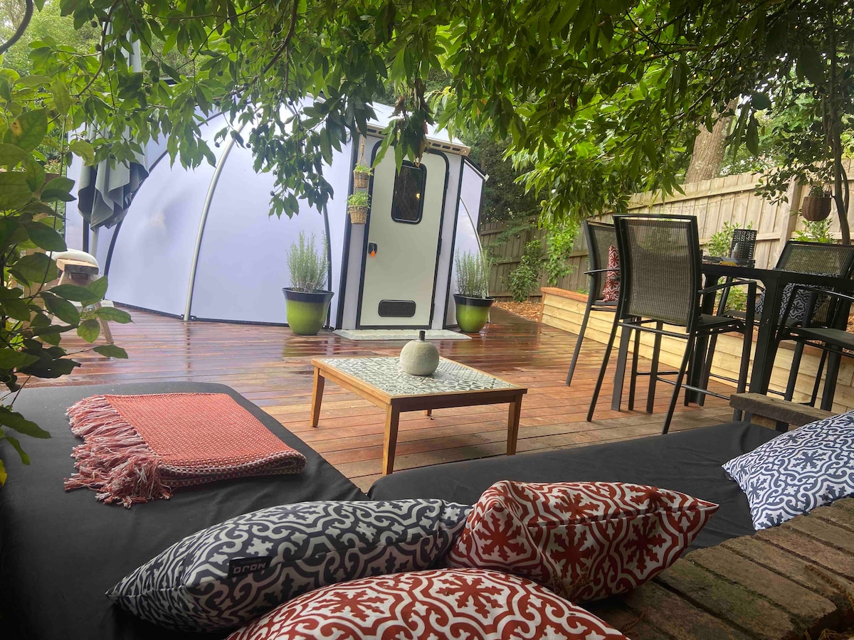 Nuestra caravana vintage de 1959 tiene solo 12 pies de largo, mejor para una pareja o dos amigos. Despierta con los sonidos de los Lyrebirds, disfruta de un paseo privado por nuestro barranco de la selva tropical y pasea por el jardín, uno de los mejores jardines privados de los Dandenongs. Ofrece un mínimo de una noche de estancia para una escapada rápida o para quedarte más tiempo y disfrutar de la paz, enciende el fogón, que está cubierto, ideal si llueve (hecho de un barril de cerveza), y asa malvaviscos.