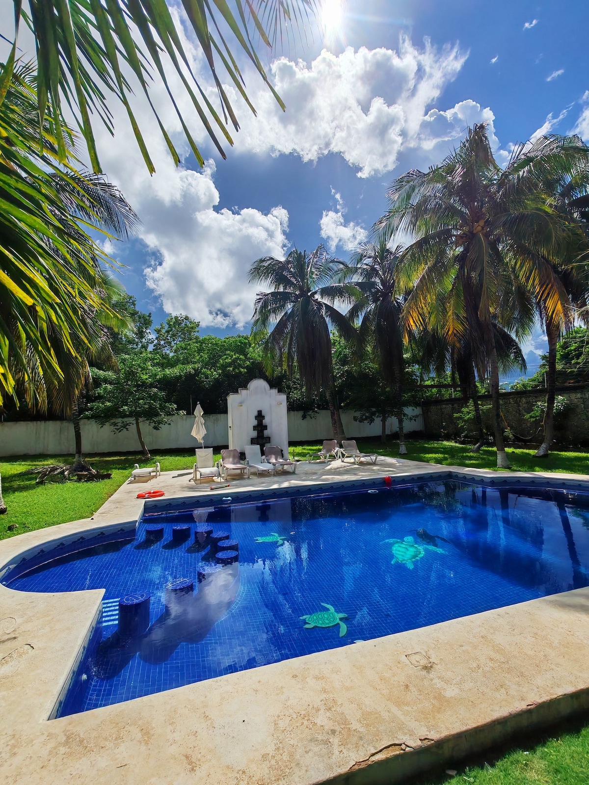 Diviértete en la piscina, y descansa en una de las increíbles 4 suites. Excelente ubicación en una zona residencial tranquila con todo tipo de comercios caminando. - Alberca privada con cascada - 4 Suites con Smart TV de 60 pulgadas, A/C y baño en Suite - Cocina totalmente equipada - Seguridad 24/7 - Estacionamiento gratis - Wi-Fi rápido 300 mbps - Nintendo Switch conSuper Mario *** Un traslado desde el aeropuerto GRATIS por estacias de 4 noches o más ***