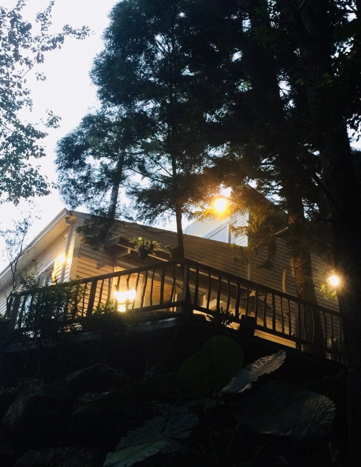 Puedes disfrutar de la vista al bosque desde las grandes ventanas del piso al techo en la sala de estar de la casa. O trae una mesa y sillas para una fecha de té de la tarde con la naturaleza en la terraza al aire libre Hay dos habitaciones tipo loft y una habitación japonesa disponibles para alojarse. Ofrece un baño, una cocina abierta y una plataforma de madera al aire libre para su uso Para obtener más información, visita lG cabin_486.