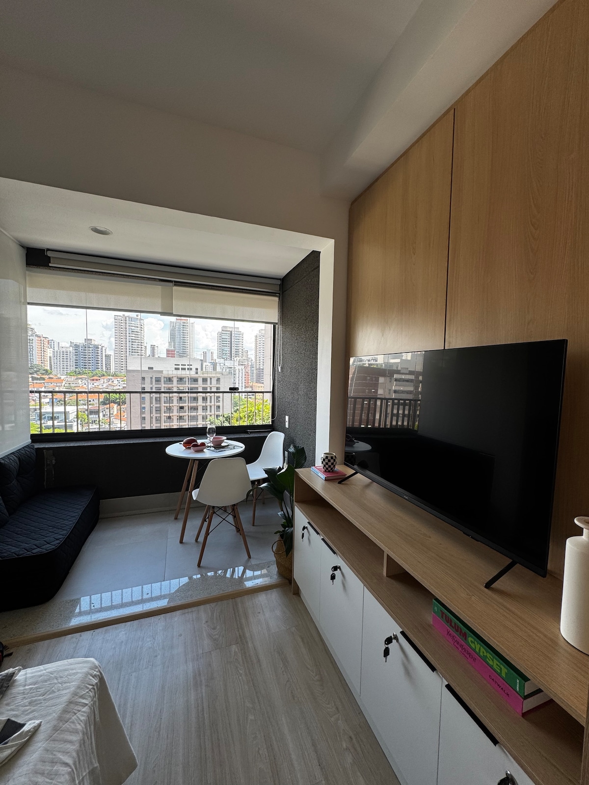 Experience One Eleven in Vila Olimpia. This modern apartment features large windows with breathtaking city views and natural light. The unit boasts 600 Mbps internet and a 4K HD TV. For total comfort, it has a Hot/Cold AC system: 27,000 BTU/h unit in the living room and 10,000 BTU/h in the bedroom. The bedroom is quiet and dark for a restful sleep. Impeccably maintained, you’ll be walking distance to top restaurants and business hubs—a safe, upscale retreat with a stunning urban backdrop.