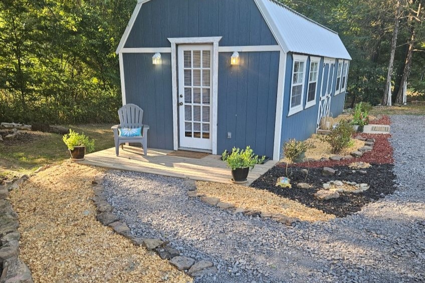 Esta cabaña se encuentra a 8 millas de la ciudad de Ozark, Arkansas, en el valle del río Arkansas. El edificio es nuevo y cuenta con cocina, baño grande y un dormitorio. Los asientos de la sala de estar también se pueden utilizar como cama doble. La ubicación está rodeada de bosque antiguo y es tranquila y silenciosa. Una buena ubicación para hacer kayak en el río Mulberry, nadar en el lago Cove, hacer senderismo en el monte Magazine o simplemente descansar en el apacible campo.