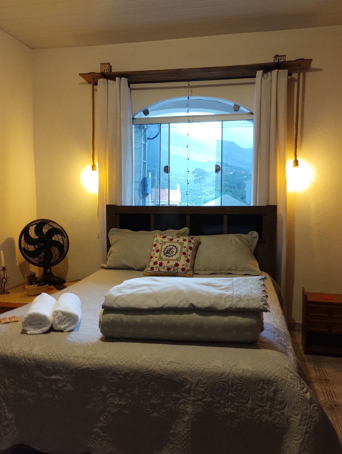 - Ubicada en el centro de la ciudad - Barrio tranquilo y sin mucho movimiento de coches y personas. - A 2 km de la entrada del Parque Nacional de Caparaó. - Supermercado con panadería cerca (200 mts). - Dos habitaciones, una con una cama doble y otra con una cama doble y una individual. -Tiene garaje -Sala con sofá, TV y Wi-Fi - Cocina completa con estufa, nevera, microondas, platos, cubiertos y más, fregadero y mesa. -Cuarto de baño con ducha eléctrica. -Balcón trasero con taque y tendedero. - Vista a las montañas.