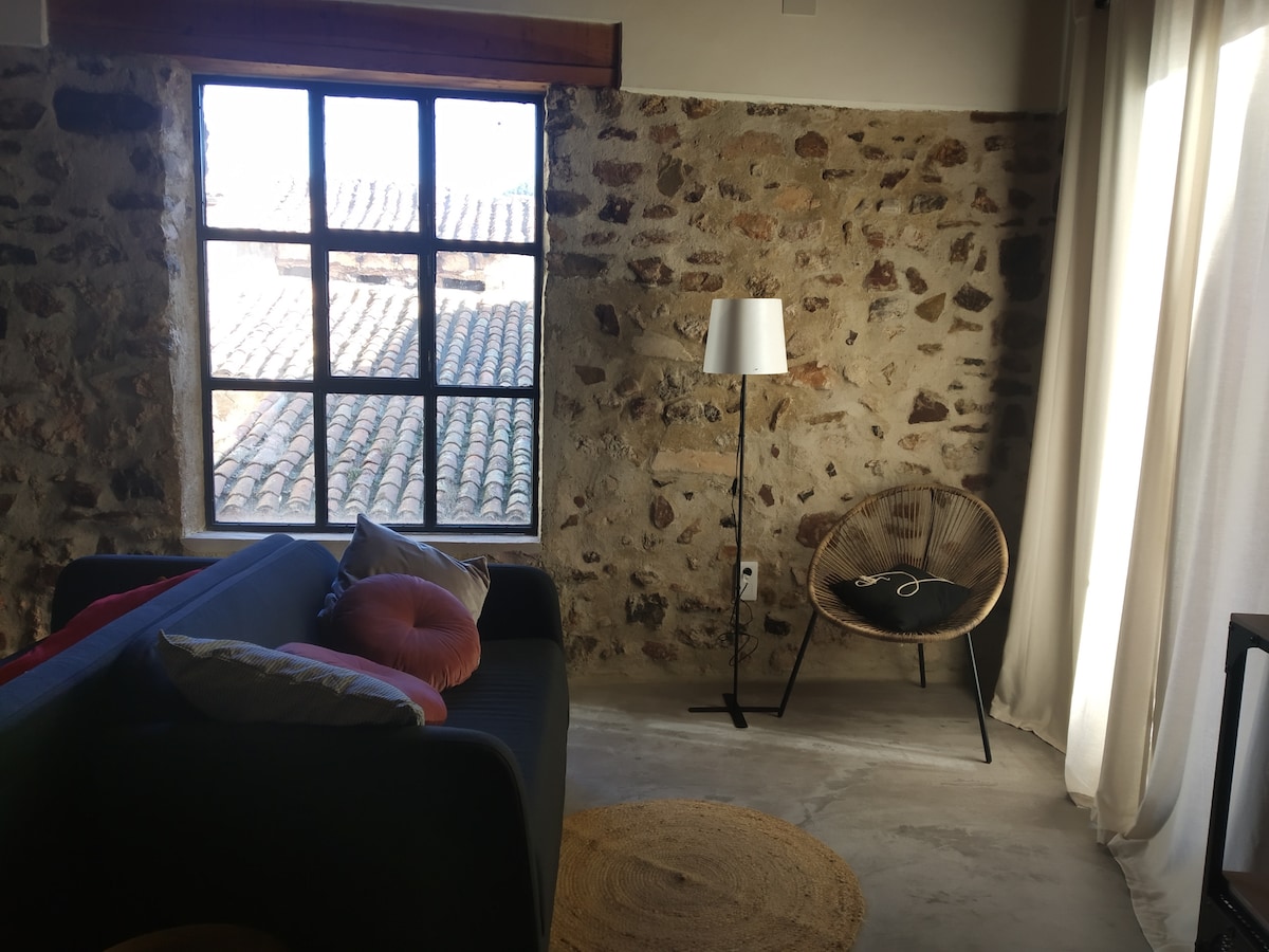 El Tossal Amplia, diáfana, muy luminosa, estilo Loft con suelos y techos de madera y paredes de piedra, con comedor salón, cocina totalmente equipada, habitación de matrimonio con bañera de hidromasaje (jacuzzi) a pies de la cama y baño wc, etc. es de uso exclusivo para ti.. Las zonas comunes con las terracitas, mirador, barbacoa y piscinita se comparten con el resto de alojamientos, pero son estancias bastante íntimas las cuales siempre suele haber poca gente porque así está diseñado.