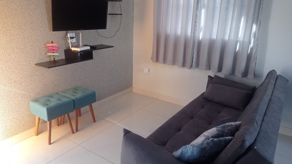 Apto en planta baja en el centro de Tanabi, ideal para hasta 3 huéspedes. Cama de matrimonio, sofá, aire acondicionado, cocina completa, Smart TV, Wi-Fi, lavadora básica y barrio tranquilo. 📍 Centro: cerca del Hospital de Tanabi, Santa Casa de Misericórdia, Facultad Anhanguera, Praça da Matriz y Parque da Cidade. 🅿️ Plaza de estacionamiento para vehículos de pequeño porte. 🔑 Cerradura inteligente — check-in autónomo.
