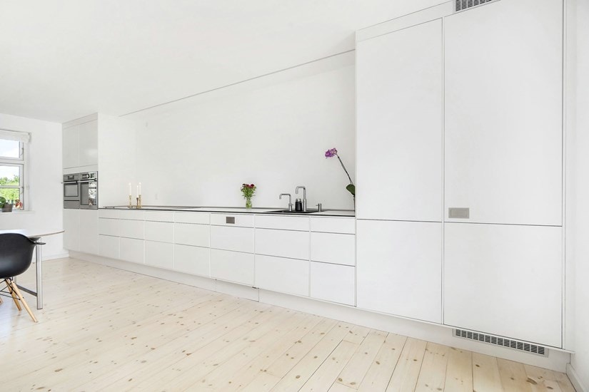 El apartamento de 110 metros cuadrados ha sido completamente renovado en un estilo nórdico moderno y cuenta con suelos de madera dura Dinesen con calefacción, accesorios Vola, una cocina de roble y granito y muebles de diseño danés. El aspecto más impresionante es la azotea privada de 50 metros cuadrados con una bañera climatizada con vistas al horizonte de Copenhague.