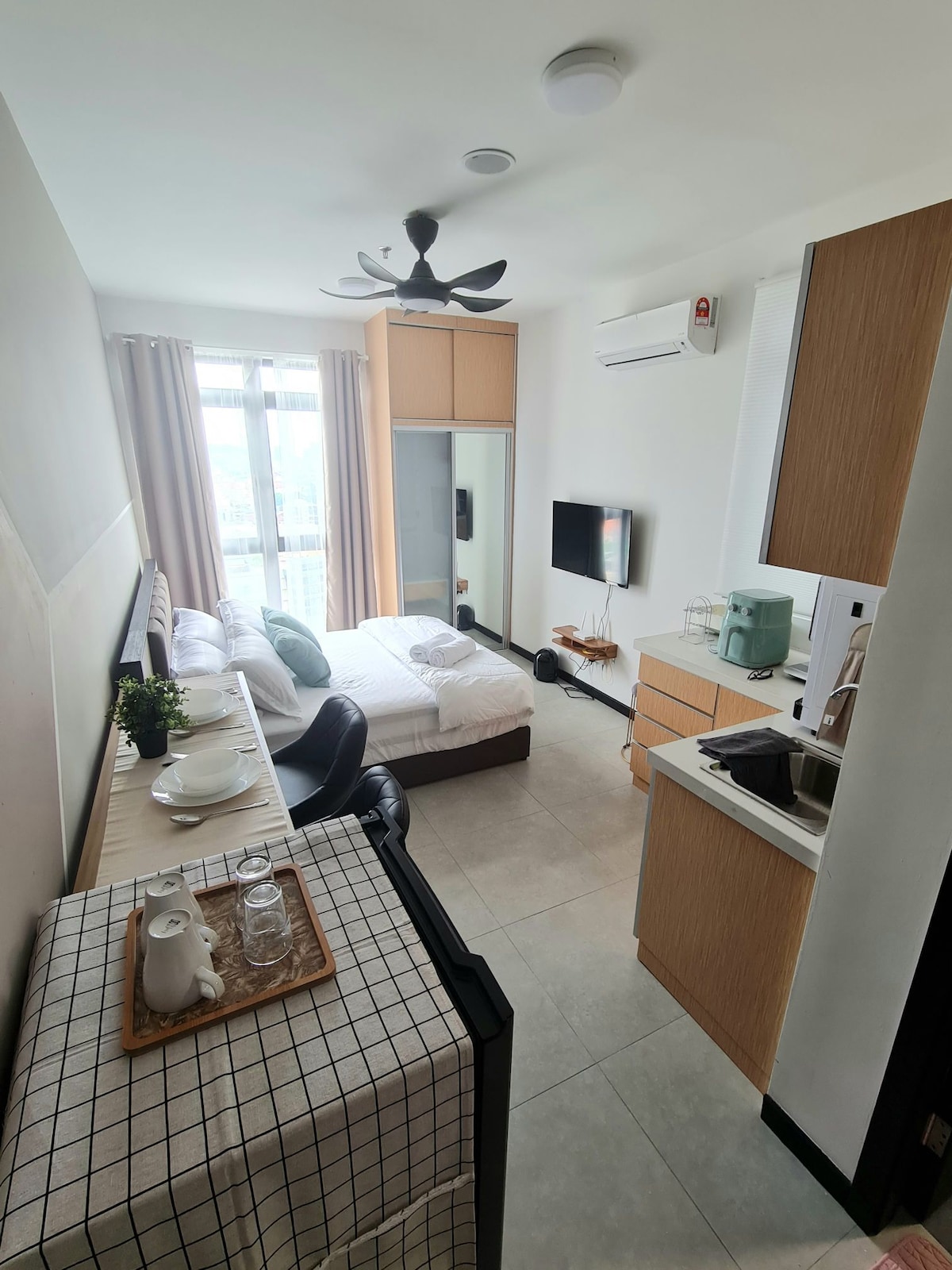 Dear guest, Our designer studio is located in the heart of Kuala Lumpur city center. The room view is direct facing the fantastic lake view. You can see the amazing KL skyline during night time. The room fully equip with kitchen amenities for light cooking. Washer and dryer machine provided for laundry in the room. Iron and iron board are available too. We have upgrade the room with smart tv and Netflix account. High speed internet available. ⚠️SWIMMING POOL UNDER MAINTENANCE⚠️