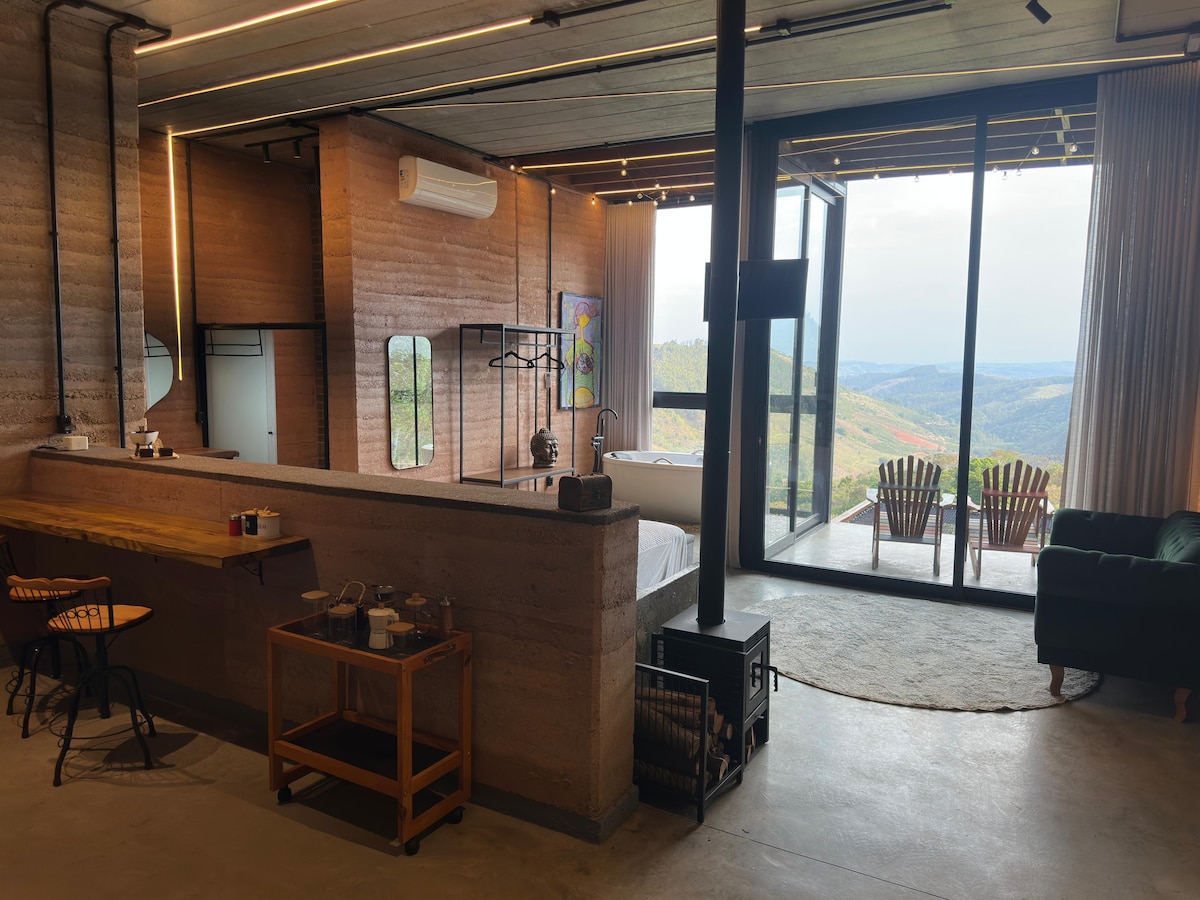 Microcasa con privacidad, aire acondicionado, bañera de inmersión, doble altura de techo con entrepiso, mezcla de decoración industrial y rústica. Energía eléctrica sostenible y 100% utilizada aquí . El chalet tiene check-in autónomo, wifi, TV con Chromecast, cama tamaño queen con 200 hilos, ducha con calefacción a gas, ducha higiénica, cortinas opacas, heladera, cocina, microondas, sándwichera, cafetera Nespresso, parrilla, pileta compartida para 3 chalets y una maravillosa vista de las montañas.