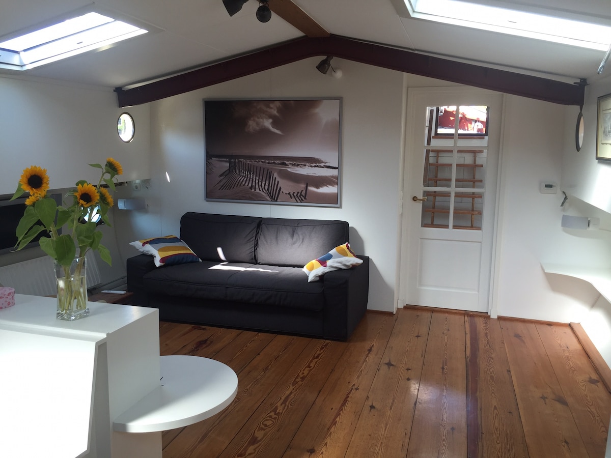 La casa flotante se encuentra en el corazón de la zona de Jordaan, en el centro de nuestra ciudad. El barco tiene 2 estudios separados de 16 m2 para mis huéspedes y otra parte del barco donde vivo yo mismo. A pocos pasos de la famosa Casa de Ana Frank y Noordermarkt. La cómoda cama tamaño king es una garantía para un buen descanso nocturno. Las enormes ventanas correderas que pueden estar completamente abiertas en días cálidos y en cortinas integradas para ofrecerte una gran vista y privacidad.