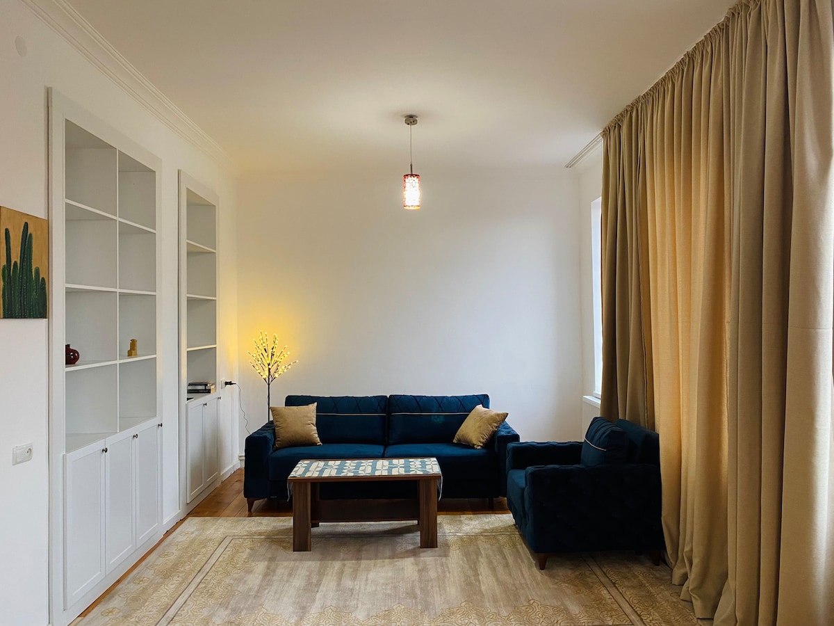 El apartamento se encuentra a 40 metros del centro de la ciudad. Hay 2 dormitorios, 1 sala de estar, 1 cocina y 1 baño. Pueden quedarse 5 personas allí. Suministro de agua las 24 horas, aire acondicionado. Durante los días de reserva, el apartamento estará completamente en tus manos, lo que significa que no habrá otros huéspedes en el apartamento contigo.