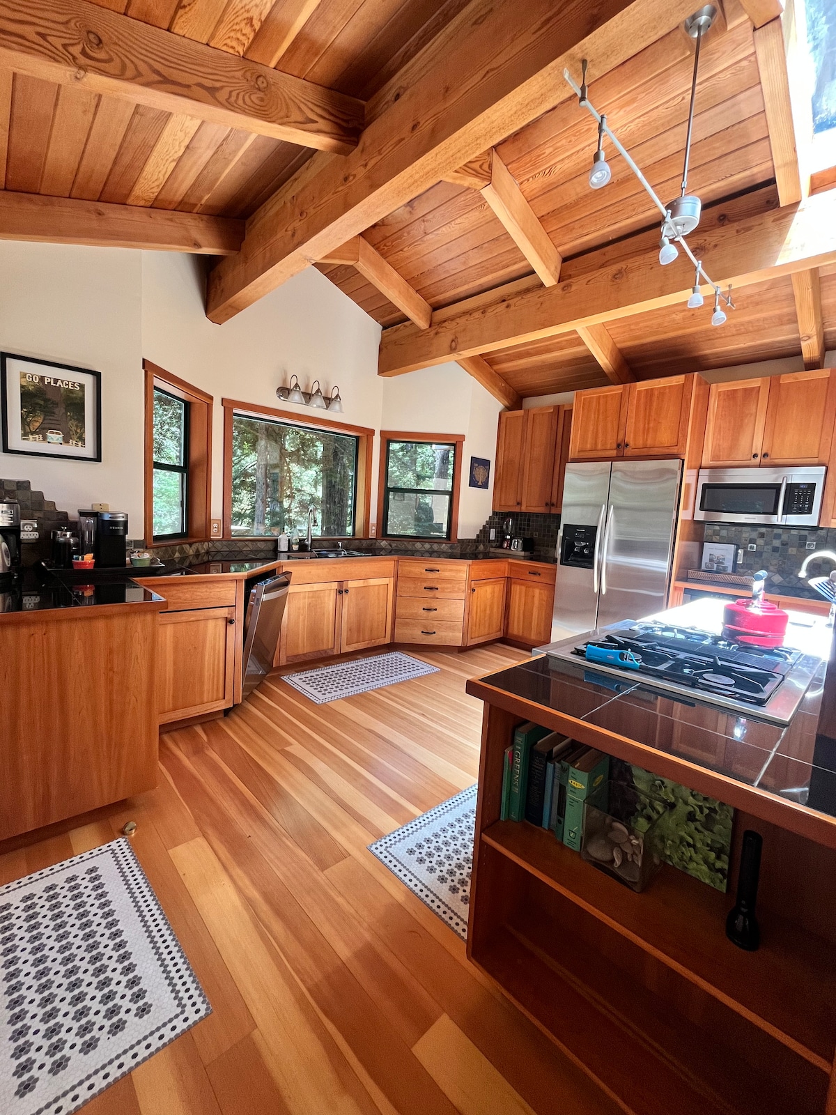 **¡Recientemente renovado/redecorado!** Esta casa fue llamada «The Ranch House» por su arquitecto Don Jacobs. Esta cabaña de los años 70 actualizada es una escapada al bosque con sensibilidad moderna. La casa está rodeada de secuoyas y tiene 2 grandes terrazas, 1 con chimenea de propano con amplios asientos, la otra con jacuzzi. El salón tiene ventanales con vistas al bosque y estufa de leña Morso. Se anima a los huéspedes a disfrutar de las rutas de senderismo, piscinas y servicios al aire libre. La casa tiene capacidad para 4 personas y cuenta con internet de fibra óptica.