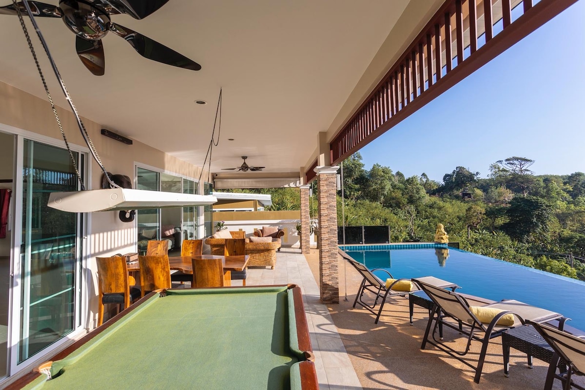 Sunset Villa es una nueva villa de lujo de cinco dormitorios en la exclusiva finca Nai Harn Baan-Bua, a solo unos minutos en coche de la impresionante playa de Nai Harn. La villa tiene piscina privada, jacuzzi, cinco baños en suite, amplios espacios comunes, una cocina totalmente equipada, mesa de billar y wifi de súper alta velocidad con Netflix. Es un lugar fantástico para unas vacaciones en familia o una escapada con amigos, con impresionantes vistas sin obstáculos que se extienden desde la finca privada hasta el lago y las colinas circundantes