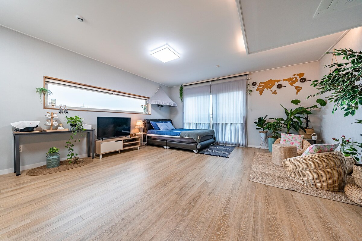 Preeria se encuentra en la acogedora zona de media montaña en el lado oeste de la isla de Jeju. Disfrutá de un cielo lleno de estrellas por la noche, el sonido de los pájaros por la mañana y las vistas tranquilas del bosque de un pueblo de Jeju. La habitación es para dos personas (máximo tres). Si su grupo tiene 3 huéspedes, incluido un bebé, haga la reserva para 3 adultos. Se va a proporcionar ropa de cama adicional para los huéspedes adicionales. La habitación para parejas es un acogedor estudio para dos personas en el segundo piso, con entrada privada, baño y cocina.