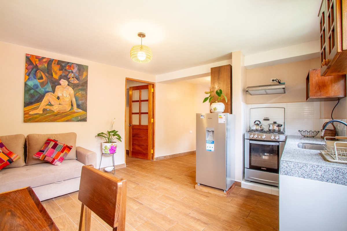 Un lindo minidepartamento en el primer piso, consta de una habitación, sala, comedor, cocineta y baño privado , tiene acabados modernos combinados con detalles de nuestra cultura, está amoblado con todo lo necesario para tener una estadía placentera, especial para parejas o persona sola.