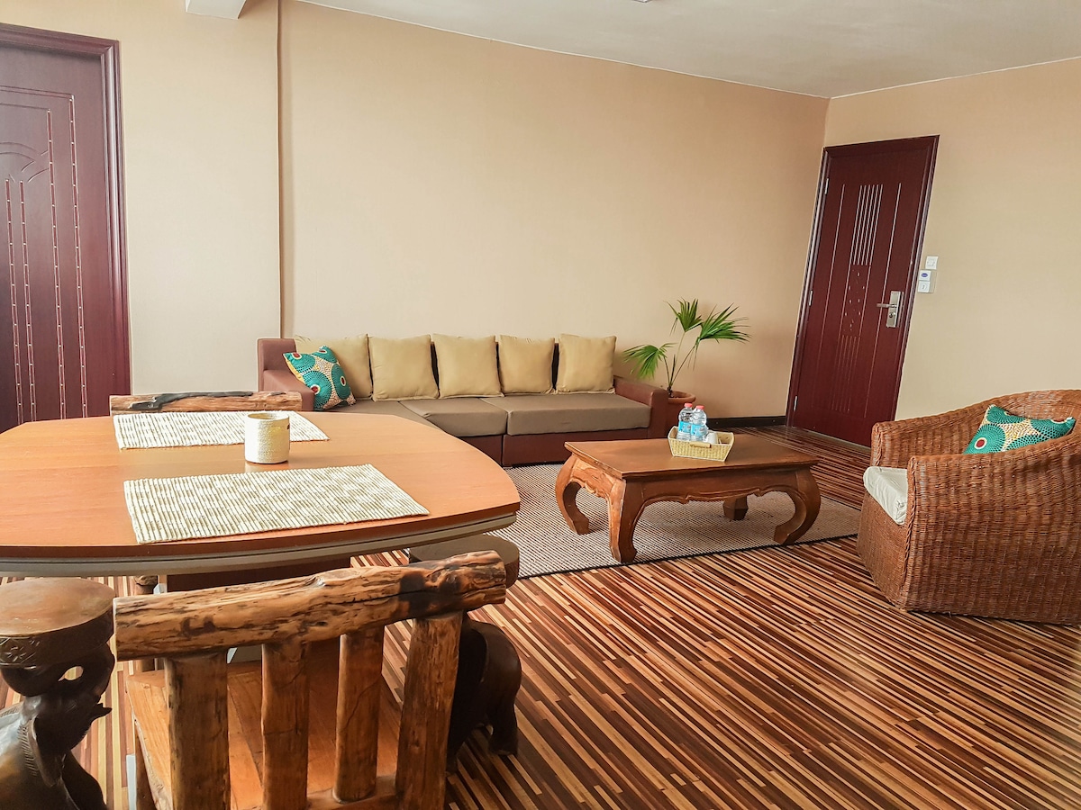 Situado en la Residencia Panorámica, una sala de estar con cocina abierta equipada, tres dormitorios y un altillo; dos baños. Balcones WiFi, TV vía satélite, minibar, Otra información. Antananarivo actualmente se enfrenta a problemas de agua, hay 2 tanques de reserva en el apartamento, pero en caso de fallo de la Jirama hay que llenar manualmente estos tanques a través de una bomba en frente del apartamento. En caso de corte de electricidad, el apartamento no tiene grupo de emergencia.