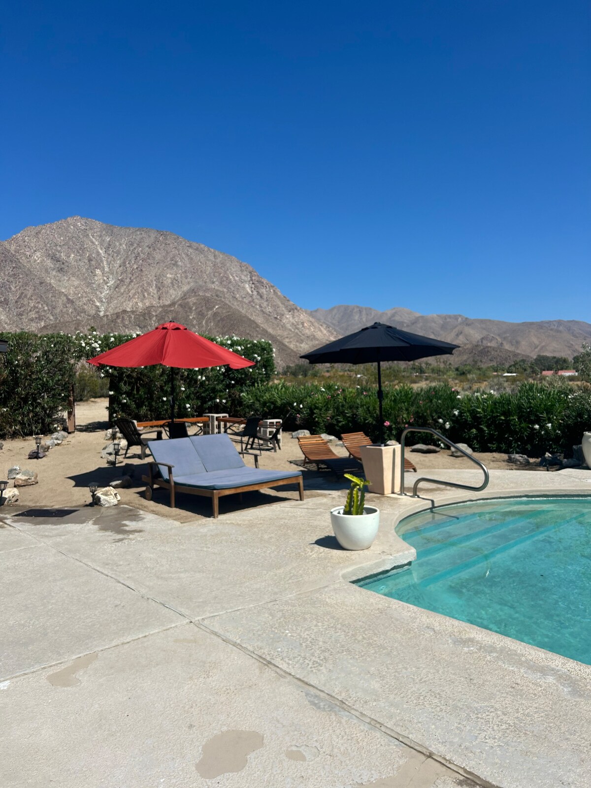 Escápate a Borrego Springs, relájate junto a la piscina con vistas a Indian Head Mtn. Disfruta del café por la mañana o de cócteles al atardecer en el sereno patio trasero. A pocos pasos del Club de Golf De Anza. Camas de lujo y servicios para una estancia perfecta. ✔️Piscina ✔️Jacuzzi ✔️Red y paletas portátiles de pickleball Fogón de✔️ gas. Contemplación de las estrellas en el cielo✔️ oscuro. ✔️Fogata de leña. ✔️Cocina equipada, cafetera, máquina de hielo. ✔️Lavadora y secadora Barbacoa de✔️ gas. Casa de✔️ mediados de siglo diseñada por William Krisel Relájate y aventúrate en Borrego