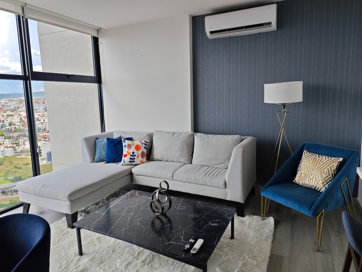 Moderno y acogedor departamento/ loft con una excelente vista en el piso 14, ubicado en la mejor zona peatonal de Juriquilla. A unos pasos de la UVM, UNAM, Sonora Grill, bancos y de un Walmart a la vuelta de la esquina. Cuenta con un amplio espacio, cama king size de primera calidad, cocina totalmente equipada, sala y comedor. Disfruta amenidades de alberca, gimnasio, sauna, jacuzzi y cancha de pádel. Ideal para estancias largas en un vecindario seguro, máxima comodidad a un excelente precio.