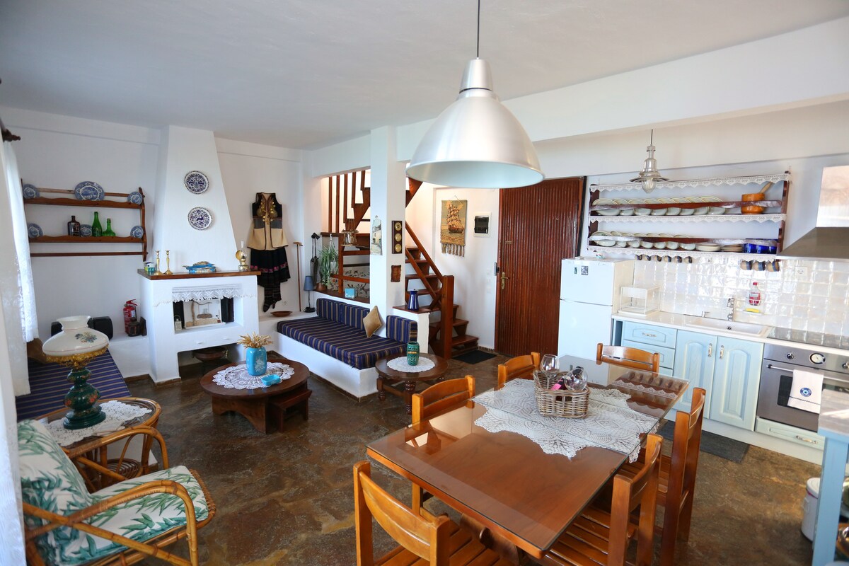 Una casa de dos plantas con plaza de aparcamiento privada en el centro del pueblo tradicional de Athytos (a 2 minutos a pie de la plaza del pueblo). La casa tiene una vista impresionante al mar y al pueblo. La paz y la relajación que ofrece se combinan con un fácil acceso al pueblo (plaza central, museo popular, cafeterías, pizzería, restaurantes, supermercados a 300 metros). La distancia a las playas cercanas es de 5 minutos en coche y 15 a pie.