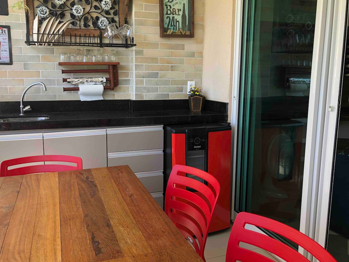 CONDOMINIO privado de 20 casas en Porto das Dunas, en la avenida principal de Beach Park. Dúplex avarandada, 5 trajes (1 externo)(2c/ AR SPLIT y SOLO 1BANHO WARM), 10-curses: 6solteiros e 4casal, 5ventiladores, cuna, silla, juegos de mesa. Jardín, terraza, piscina, cenador, campo, ducha, barbacoa / barbacoa, ducha y terraza privada. Comedor, sala de estar, 2 TVsmart, piscina, wifi, cocina con estufa, microondas, nevera, licuadora, utensilios. Coche de 3 Vagas.