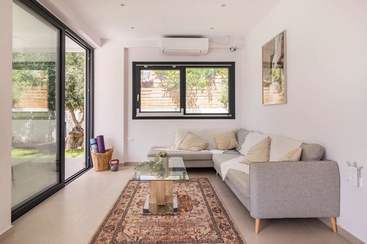 Estudio luminoso a poca distancia de la playa y del centro de Kalamata. Gran supermercado y panadería a 1 minuto a pie. Semi-sótano con entrada privada y acceso al patio con jardín. Relájate en el sauna o comienza el día con una ducha refrescante. Prepara tu café y disfrútalo en el patio.