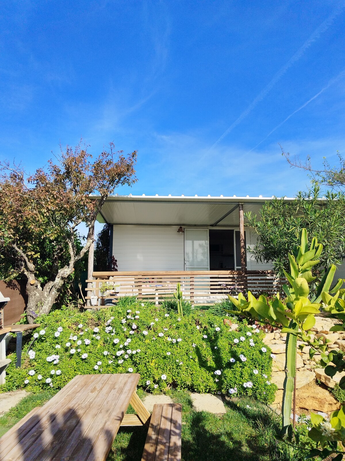 esta bonita cabaña elegante con encanto con vistas a la ría Formosa terraza al aire libre al sur frente a la gran sala de estar cómoda ,cocina exposición este, dormitorio, baño y aseo , ducha al aire libre con agua caliente solar , todas las habitaciones tienen vistas a la ría
