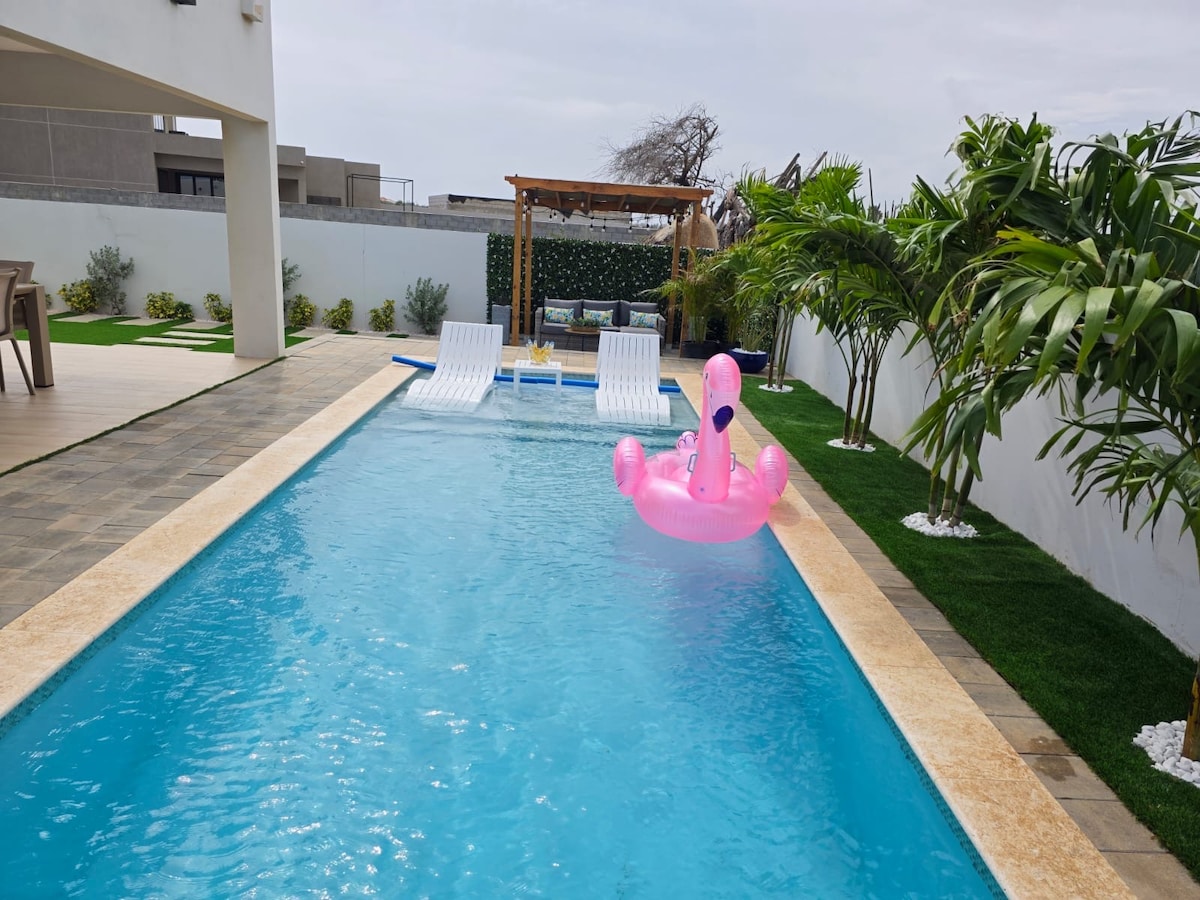 Experience luxury at Modern Oasis, a 3-bedroom, 2.5-bath villa just 3 minutes from Eagle Beach. This stunning retreat features a chef’s kitchen, elegant living spaces, and spacious bedrooms with Smart TVs, including an 85" in the main suite. Relax in the upstairs lounge or step outside to enjoy a resort-style pool,stonewall outdoor shower, and a fully equipped outdoor kitchen with pergola seating. Perfect for families or groups, this tropical getaway blends modern comfort with paradise vibes.🌴
