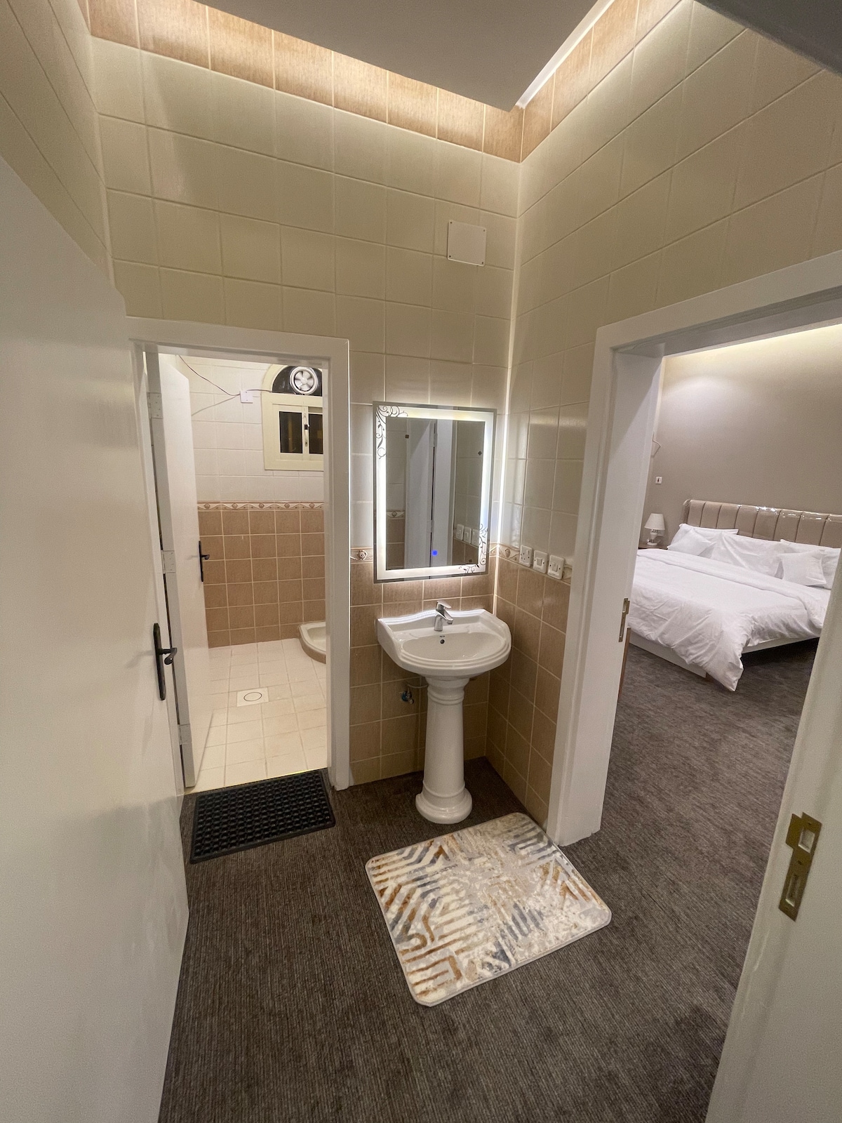 Alójate en una residencia de lujo cerca de todo lo que quieras visitar. Servicios: • Parque y pasarela Al-Mansak (1 minuto a pie) • Mezquita (1 minuto a pie) • Calle comercial (a 1 minuto a pie). Características del departamento: • Patio (asientos al aire libre + parrilla de carbón) • Sala de estar (zona de estar + TV + mesa de comedor) • Dormitorio tamaño king con baño privado. • Cocina (cafetera + nevera + horno eléctrico y de gas + parrilla + lavadora y secadora automática) • Habitación con 4 camas y baño privado.