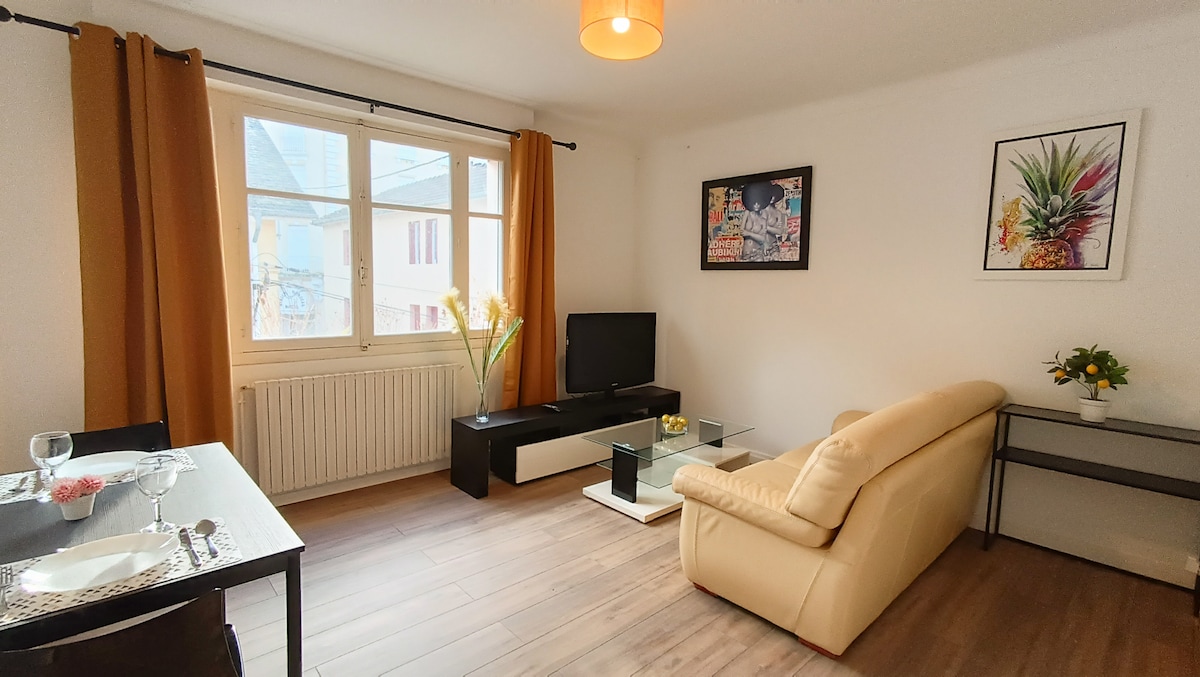 A coté des halles, petit appartement douillet très lumineux, idéal pour découvrir Lourdes et sa région. Situé dans la ville haute et proche d' un grand parking gratuit à 1 minute à pied. Tous les commerces sont à proximité immédiate. Le lit est escamotable, ce qui permet un gain de place. La cuisine est entièrement équipée et la salle de bain est spacieuse. Très agréable grâce à son exposition sud avec vue sur les montagnes en second plan. Le sanctuaire se trouve à environ 15 minutes à pied.